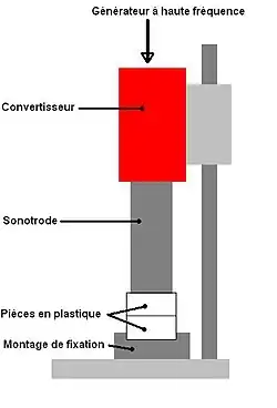 Des vibrations de haute fréquence sont envoyées aux deux pièces par le biais d'un outil vibrant appelé sonotrode ou tête de soudure. La soudure se fait grâce à la chaleur engendrée à l'interface des deux pièces.