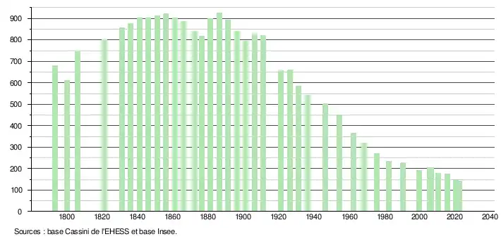 L'évolution du nombre d'habitants est connue à travers les recensements de la population effectués dans la commune depuis 1793. Pour les communes de moins de 10 000 habitants, une enquête de recensement portant sur toute la population est réalisée tous les cinq ans, les populations de référence des années intermédiaires étant quant à elles estimées par interpolation ou extrapolation[27]. Pour la commune, le premier recensement exhaustif entrant dans le cadre du nouveau dispositif a été réalisé en 2005[28].