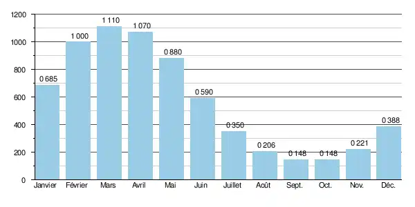 La rivière présente des fluctuations saisonnières de débit fort peu marquées, avec des hautes eaux de printemps portant le débit mensuel moyen entre 0,88 et 1,11 m3/s, de février à mai inclus (maximum en mars-avril). Les basses eaux ont lieu en été et en automne, d'août à novembre inclus, avec une baisse du débit moyen mensuel jusqu'au niveau de 0,15 m3/s aux mois de septembre et d'octobre.