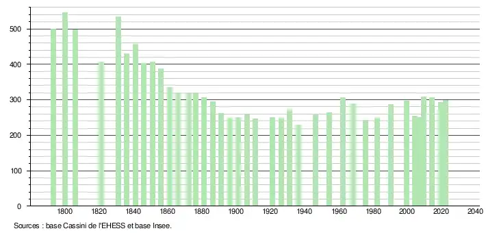 L'évolution du nombre d'habitants est connue à travers les recensements de la population effectués dans la commune depuis 1793. Pour les communes de moins de 10 000 habitants, une enquête de recensement portant sur toute la population est réalisée tous les cinq ans, les populations de référence des années intermédiaires étant quant à elles estimées par interpolation ou extrapolation[23]. Pour la commune, le premier recensement exhaustif entrant dans le cadre du nouveau dispositif a été réalisé en 2004[24].