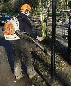 Un souffleur de feuilles est une machine qui projette un flux d'air pour éloigner ou regrouper les feuilles mortes tombées au sol, souvent pour en faire des tas qu'une machine aspirante pourra éventuellement recueillir plus tard. Il fonctionne avec un moteur à deux temps, à quatre temps (« souvent moins bruyants et rejettent moins de gaz nocifs que les appareils avec moteur à deux temps »[1] ou avec un moteur électrique. Le moteur deux temps est très polluant (plus qu'une grosse voiture)[3]. Il a été conçu pour déplacer ou collecter les feuilles mortes sans avoir à utiliser de balai ou râteau lors grâce à un moteur fonctionnant généralement à l'essence.