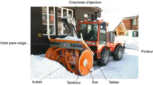 - les turbo-fraises qui possèdent deux organes rotatifs : le tambour à aubes principal qui attaque la neige et une deuxième roue à aubes destiné à l’éjection de la neige dans une cheminée d’éjection.