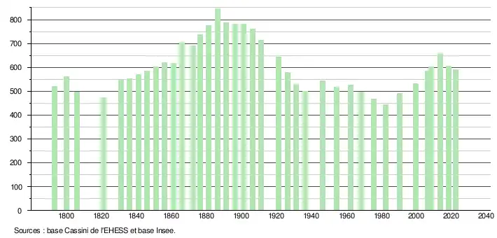 L'évolution du nombre d'habitants est connue à travers les recensements de la population effectués dans la commune depuis 1793. Pour les communes de moins de 10 000 habitants, une enquête de recensement portant sur toute la population est réalisée tous les cinq ans, les populations de référence des années intermédiaires étant quant à elles estimées par interpolation ou extrapolation[14]. Pour la commune, le premier recensement exhaustif entrant dans le cadre du nouveau dispositif a été réalisé en 2008[15].
