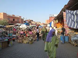 Les souks de la médina de Marrakech sont de véritables labyrinthes d'échoppes et d'ateliers artisanaux, organisés par quartiers et par métiers et regroupent plus de 2600 artisans marocains pour une vingtaine de corporations. Le souk principal s’étend au centre de la médina, du nord de la célèbre place Jemaa el-Fna à la Medersa Ben Youssef. Les allées centrales qui traversent les souks sont réservées aux échoppes de ventes alimentées à l’origine par les artisans qui travaillent dans les ruelles adjacentes.