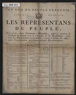 - ↑ Le texte de la Convention précise « au département de Rhône-et-Loire » alors que, le 29 brumaire an II, elle l’avait divisé en deux.