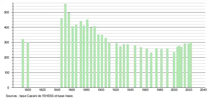 L'évolution du nombre d'habitants est connue à travers les recensements de la population effectués dans la commune depuis 1793. Pour les communes de moins de 10 000 habitants, une enquête de recensement portant sur toute la population est réalisée tous les cinq ans, les populations de référence des années intermédiaires étant quant à elles estimées par interpolation ou extrapolation[45]. Pour la commune, le premier recensement exhaustif entrant dans le cadre du nouveau dispositif a été réalisé en 2004[46].