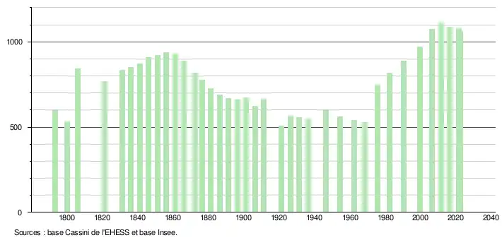 L'évolution du nombre d'habitants est connue à travers les recensements de la population effectués dans la commune depuis 1793. Pour les communes de moins de 10 000 habitants, une enquête de recensement portant sur toute la population est réalisée tous les cinq ans, les populations de référence des années intermédiaires étant quant à elles estimées par interpolation ou extrapolation[17]. Pour la commune, le premier recensement exhaustif entrant dans le cadre du nouveau dispositif a été réalisé en 2006[18].