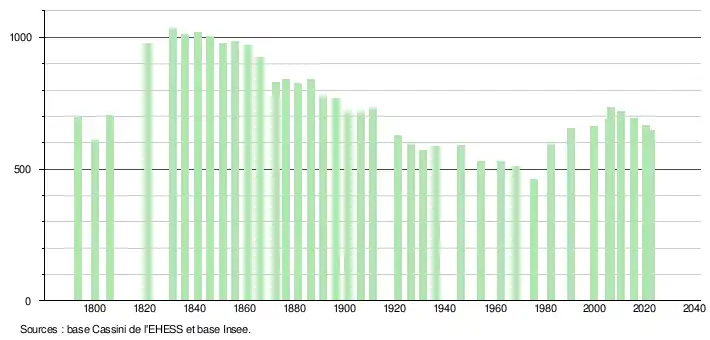 L'évolution du nombre d'habitants est connue à travers les recensements de la population effectués dans la commune depuis 1793. Pour les communes de moins de 10 000 habitants, une enquête de recensement portant sur toute la population est réalisée tous les cinq ans, les populations de référence des années intermédiaires étant quant à elles estimées par interpolation ou extrapolation[16]. Pour la commune, le premier recensement exhaustif entrant dans le cadre du nouveau dispositif a été réalisé en 2005[17].