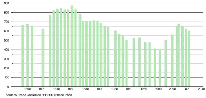 L'évolution du nombre d'habitants est connue à travers les recensements de la population effectués dans la commune depuis 1793. Pour les communes de moins de 10 000 habitants, une enquête de recensement portant sur toute la population est réalisée tous les cinq ans, les populations de référence des années intermédiaires étant quant à elles estimées par interpolation ou extrapolation[15]. Pour la commune, le premier recensement exhaustif entrant dans le cadre du nouveau dispositif a été réalisé en 2008[16].