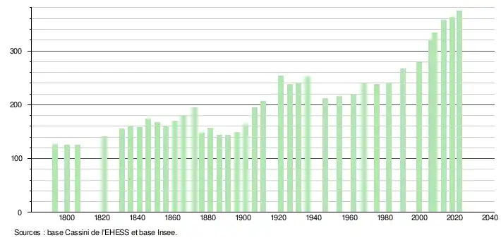 L'évolution du nombre d'habitants est connue à travers les recensements de la population effectués dans la commune depuis 1793. Pour les communes de moins de 10 000 habitants, une enquête de recensement portant sur toute la population est réalisée tous les cinq ans, les populations de référence des années intermédiaires étant quant à elles estimées par interpolation ou extrapolation[22]. Pour la commune, le premier recensement exhaustif entrant dans le cadre du nouveau dispositif a été réalisé en 2008[23].