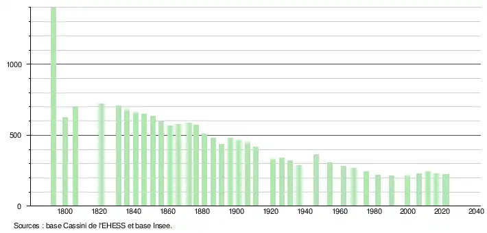 L'évolution du nombre d'habitants est connue à travers les recensements de la population effectués dans la commune depuis 1793. Pour les communes de moins de 10 000 habitants, une enquête de recensement portant sur toute la population est réalisée tous les cinq ans, les populations de référence des années intermédiaires étant quant à elles estimées par interpolation ou extrapolation[26]. Pour la commune, le premier recensement exhaustif entrant dans le cadre du nouveau dispositif a été réalisé en 2006[27].