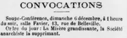 - ↑ « LA SOUPE ANARCHISTE. Le groupe anarchiste de Paris avait adressé la semaine dernière un nouvel appel aux mendiants, aux vagabonds et aux repris de justice," en leur offrant une soupe et une conférence, la nourriture de l'esprit et du corps. La distribution de soupes s'est faite hier â la salle Favié à plus de trois mille indigents ; une partie de ces malheureux ont écouté les discours des compagnons Martinet, Leboucher, etc. Mme Séverine avait tenu à aider elle-même les compagnes anarchistes, distributrices de soupes. » - Le Petit Journal, 7 décembre 1891, page 2.