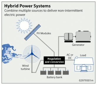 À titre d'exemple, aux Pays-Bas en , Vattenfall a proposé une solution hybride combinant solaire (38 MW photovoltaïques), éolien (six turbines pour 22 MW) et batteries (12 MWh de capacité) pour une production annoncée de 60 MW (en 2020). L'opérateur diminue ainsi le temps sans production ou sans disponibilité d'énergie, ainsi que son coût de connexion au réseau[33].