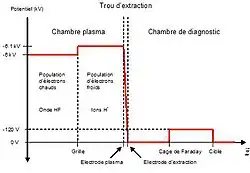 Sur le schéma présentant les différents potentiels des éléments du système d’extraction, on peut remarquer que deux enceintes sont séparées par le trou d’extraction du faisceau. Il s’agit de la chambre plasma, déjà présentée, et de la chambre de diagnostic, où le faisceau vient frapper sur la cible et les mesures sont effectuées.
