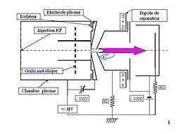 Cette source se présente sous la forme d’une enceinte reliée à un guide d’ondes rectangulaire situé à l’extrême gauche de la figure. Ce dernier permet l’injection d'une onde HF nécessaire au processus de résonance cyclotronique électronique, expliqué ci-après. On injecte cette onde HF sous forme pulsée.