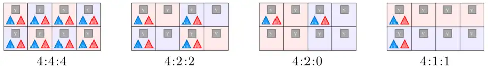 Chaque pixel de l'image peut être reconstitué à partir de ces trois composantes : la luminance Y', la chrominance bleu ou différence bleu (Cb) et la chrominance rouge (Cr). Cependant, on diminue souvent le nombre d'échantillons pour réduire le nombre d'informations à transmettre : un échantillon pourra être utilisé pour plusieurs pixels. Pour quantifier le sous-échantillonnage, on se représente une région de quatre pixels de largeur sur 2 pixels de hauteur et on indique une série de 3 nombres J:a:b (par exemple 4:2:2).