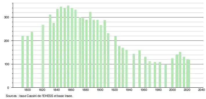 L'évolution du nombre d'habitants est connue à travers les recensements de la population effectués dans la commune depuis 1793. Pour les communes de moins de 10 000 habitants, une enquête de recensement portant sur toute la population est réalisée tous les cinq ans, les populations de référence des années intermédiaires étant quant à elles estimées par interpolation ou extrapolation[27]. Pour la commune, le premier recensement exhaustif entrant dans le cadre du nouveau dispositif a été réalisé en 2005[28].