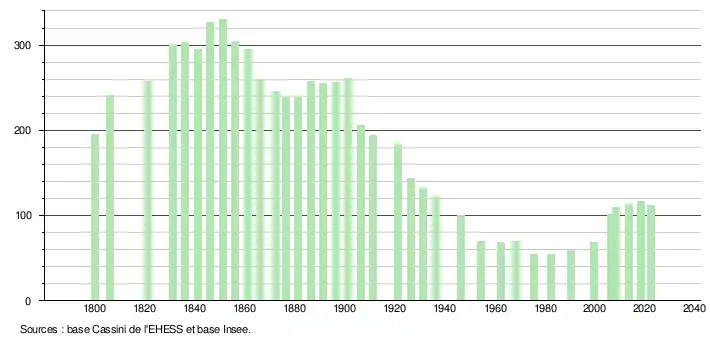 L'évolution du nombre d'habitants est connue à travers les recensements de la population effectués dans la commune depuis 1800. Pour les communes de moins de 10 000 habitants, une enquête de recensement portant sur toute la population est réalisée tous les cinq ans, les populations de référence des années intermédiaires étant quant à elles estimées par interpolation ou extrapolation[24]. Pour la commune, le premier recensement exhaustif entrant dans le cadre du nouveau dispositif a été réalisé en 2008[25].