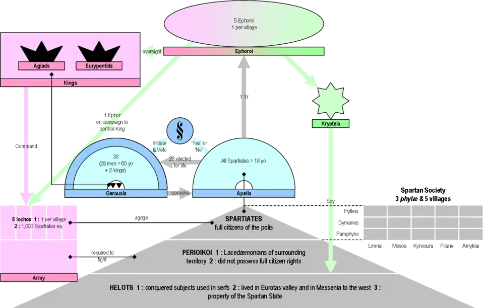 L'État était gouverné par deux rois héréditaires des familles Agiade et Eurypontide, tous deux descendants d'Héraclès et égaux en autorité, de sorte que l'on ne pouvait pas agir contre le pouvoir et les actes politiques de son collègue, bien que le roi Agiad ait reçu un plus grand honneur en vertu de l'ancienneté de sa famille pour être le « plus ancien existant » (Herod. vi. 5).