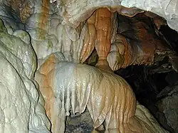 - ↑ Concrétions se formant quand l'eau ruisselle le long du plafond ou de la paroi de la grotte.