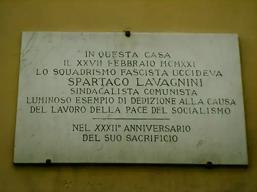 Spartaco Lavagnini, militant du parti socialiste italien et précurseur du "tournant" communiste, secrétaire régional du syndicat des cheminots et directeur du périodique florentin Azione Comunista, fut tué par les "escadrons" (squadristi) fascistes en représailles à l'attaque anarchiste contre un cortège formé le 27 février 1921 pour l'inauguration des Fasci d'avanguardia dans lequel l'étudiant Carlo Menabuoni et le carabinier Antonio Petrucci avaient trouvé la mort. En réponse, les fascistes abattirent le même jour le cheminot socialiste Gino Mugnai, coupable de ne pas avoir enlevé son chapeau au passage du wagon transportant le carabinier à l'hôpital, et quelques heures plus tard, les escadrons fascistes attaquent le siège de l'Association communiste des invalides de guerre, où ils trouvent Spartaco Lavagnini - totalement étranger aux événements - qui est abattu[1].
