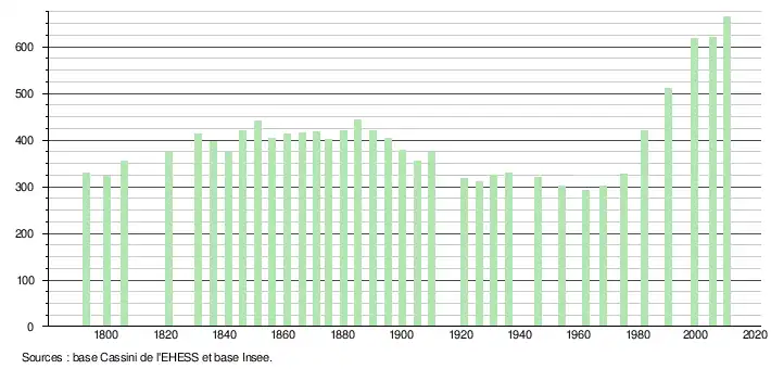 - ↑ Par convention dans Wikipédia, le principe a été retenu de n’afficher dans le tableau des recensements et le graphique, pour les populations légales postérieures à 1999, que les populations correspondant à une enquête exhaustive de recensement pour les communes de moins de 10 000 habitants, et que les populations des années 2006, 2011, 2016, etc. pour les communes de plus de 10 000 habitants, ainsi que la dernière population légale publiée par l’Insee pour l'ensemble des communes.