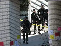 - ↑ Aux États-Unis, État fédéral, il existe un grand nombre de forces de police distinctes suivant l'échelon territorial (fédéral, État, comtés ou villes) ou selon le domaine (drogue, intervention, transports, frontières, etc.), capables de mener des opérations à hauts risques avec un armement et des tactiques adaptées. Le nom à l'origine était « special weapons attack tactics ».