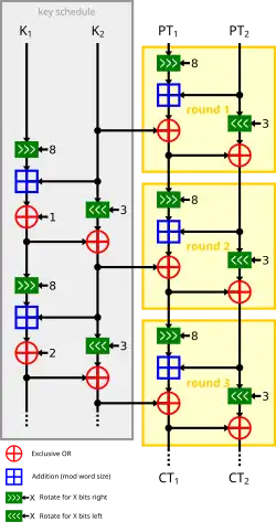 - ↑ (en) Ray Beaulieu, Douglas Shors, Jason Smith, Stefan Treatman-Clark, Bryan Weeks et Louis Wingers, « The SIMON and SPECK Families of Lightweight Block Ciphers » [PDF], sur Cryptology ePrint Archive (en), Report 2013/404, (consulté le ), p. 1.