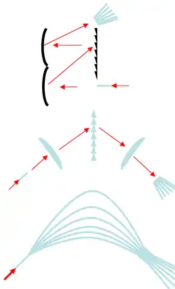 - ↑ La réfraction est la propriété d'un faisceau lumineux d'être dévié à l'interface de deux milieux d'indice différent. Un milieu dispersif, comme le verre d'un prisme par exemple, possède en plus la propriété d'avoir un indice différent pour chaque longueur d'onde. Ainsi, les différentes longueurs d'onde constituant un faisceau blanc arrivant sur un prisme sont déviées avec des angles différents, ce qui crée un arc-en-ciel en sortie.