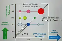 Cette séquence de trois impulsions va être répétée N fois successivement pour numériser un signal de X points à chaque séquence, donnant alors lieu à une expérience de FT-ICR 2D MS avec N×X points au total, avec N points dans la dimension F1, appelée dimension des précurseurs, et X points dans la dimension F2, appelée dimension des fragments. Entre chaque répétition de cette séquence d'impulsions, on fera varier la période d'encodage de manière que les ions qui soient désexcités, donc ramenés au centre de la cellule ICR et fragmentés et/ou réagissant, soient de nature différente au sein de l'échantillon. A la fin, on obtient une carte 2D qui représente le résultat de notre expérience. Sur la diagonale de la carte 2D, appelée diagonale d'auto-corrélation, apparaissent les pics représentant les ions parents ou les ions précurseurs, tandis que les pics apparaissant sur la ligne horizontale, à la hauteur d'un ion parent ou précurseur, représentent les fragments de l'ion parent ou précurseur. L'analyse de ces données permet de donner des informations sur la formule chimique ou la structure moléculaire des éléments présents dans l'échantillon étudié par FT-ICR 2D MS.
