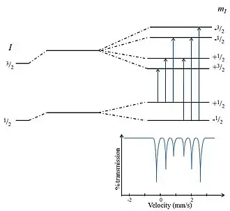 L'effet Zeeman désigne la levée de dégénérescence des niveaux d'énergie du noyau sous l'effet d'un champ magnétique environnant. Un noyau de spin I produira 2 I + 1 sous-niveaux d'énergie en présence d'un champ magnétique. Par exemple, un noyau de spin 3/2 donnera naissance à 4 sous-niveaux non-dégénérés caractérisé par un nombre quantique mI valant +3/2, +1/2, -1/2 et -3/2. La différence d'énergie entre les niveaux est typiquement de l'ordre de 10−7 eV. Une règle de sélection indique qu'une transition entre le niveau fondamental et l'état excité ne peut se produire que si mI change de 0 ou de ±1. Pour une transition de I = 1/2 à I = 3/2, cela donne donc 6 niveaux d'énergie différents[6]. C'est ce qui est observé en pratique dans la majorité des cas.