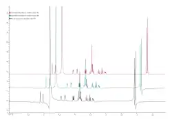 - ↑ Pour des raisons historiques, l’axe des fréquences en RMN est orienté généralement de droite à gauche, c’est-à-dire à l’opposé du « blindage ».