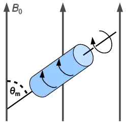 Dans les années 1960, Andrew[4] a montré cependant qu'il était possible d'obtenir des spectres correspondant à la moyenne isotrope des interactions en faisant tourner l'échantillon autour d'un axe incliné de arccos(1/√3) ≈ 54° 44' par rapport au champ magnétique. Cet angle est appelé, l’angle magique, et la technique de rotation à l'angle magique est en général désignée par son acronyme anglais : MAS (pour magic angle spinning)