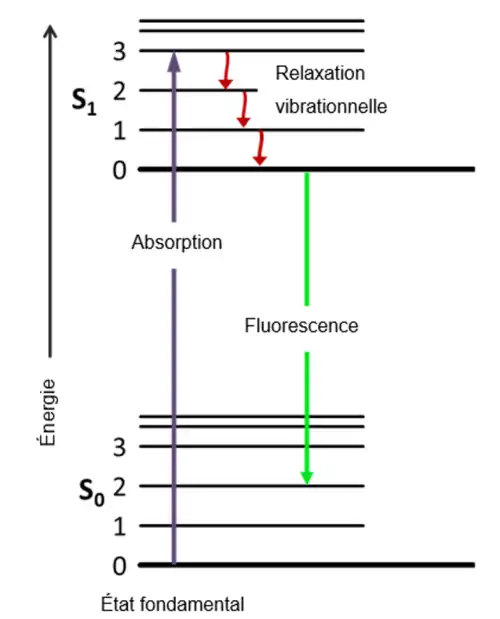 En spectroscopie de fluorescence, les électrons de certaines molécules ou des atomes gazeux (en émission de fluorescence atomique) sont excités en absorbant des rayons électromagnétiques, en UV et visible, selon leur longueur d’onde d’absorption[5]. Il en résulte ainsi un changement de niveau d’énergie à la hausse des électrons des atomes. En effet, chaque niveau électronique (S) possède plusieurs niveaux vibrationnels[7] (1, 2, 3, …), comme dans le diagramme partiel de Jablonski de la Figure 2 ci-dessous.