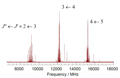 Les molécules diatomiques hétérogènes comme le monoxyde de carbone (CO) possèdent parmi les spectres de rotation les plus simples. C'est également le cas pour des molécules triatomiques comme le cyanure d'hydrogène (HC≡N) pour les molécules linéaires ou l'isocyanure d'hydrogène (HN=C:) pour les molécules non-linéaires. Plus le nombre d'atomes croît, plus le spectre devient complexe, les raies dues à différentes transitions commençant à se superposer.