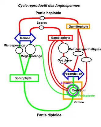 - en ocre, les phases mobiles : le gamétophyte mâle immature (grain de pollen) germe sur le stigmate, forme un tube pollinique qui transporte 2 noyaux spermatiques jusqu'à l'ovule. Alors que chez les gymnospermes l'un des deux avortait, ici on observe une double fécondation, l'une donnant l'embryon, l'autre l'albumen (triploïde dans la majorité des cas) par fusion d'un noyau spermatique et de 2 noyaux polaires issus du gamétophyte femelle.