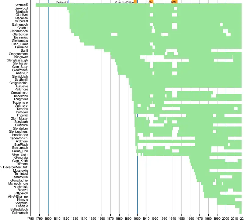 L'histoire de ces distilleries a été marquée par des événements notables : l'Excise Act qui légalise la distillation de whisky en 1823, la crise des Pattison qui est à l'origine d'une vague de fondation de distilleries dont beaucoup existent encore, les deux guerres mondiales qui amènent à des fermetures destinées à économiser l'orge, une crise de surproduction dans les années 1980.