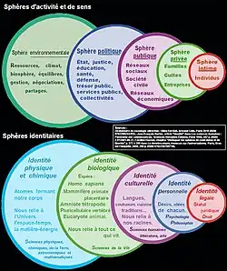Le sociologue Michel Grossetti explique qu'en sciences sociales il existe plusieurs manières de désigner des ensembles d’activités : « mondes sociaux » (thématisé notamment par Tamotsu Shibutani, Anselm Strauss, Howard S. Becker, Ernest Burgess), « champs sociaux » (au sens de Pierre Bourdieu), « configuration » (au sens de Norbert Elias), « marché » (au sens d'Harrison White), et « sphères d’activité » (au sens de Max Weber)[4],[5]. Cette analyse rejoint celle du sociologue Bernard Lahire[α]. Celui-ci insiste sur le fait que la variété sémantique est l'indice d'une difficulté analytique, et qu'il ne faut pas se représenter les sphères comme étant totalement séparées[β].