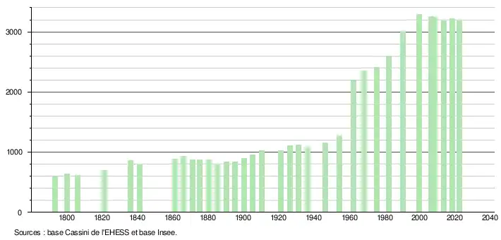 L'évolution du nombre d'habitants est connue à travers les recensements de la population effectués dans la commune depuis 1793. Pour les communes de moins de 10 000 habitants, une enquête de recensement portant sur toute la population est réalisée tous les cinq ans, les populations de référence des années intermédiaires étant quant à elles estimées par interpolation ou extrapolation[22]. Pour la commune, le premier recensement exhaustif entrant dans le cadre du nouveau dispositif a été réalisé en 2008[23].