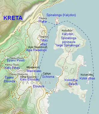 Spinalónga est située en Crète à l’est de la ville d'Eloúnda, au-delà d’anciens marais salants et d’un étroit chenal artificiel enjambé par un pont, à l'est du village maritime de Pláka, situé à 5 km au nord d'Eloúnda, juste en face de la pointe nord de la presqu'île. Spinalónga a été rebaptisée Kalydón par un décret de 1954, nom emprunté à une ville d'Étolie disparue[1].