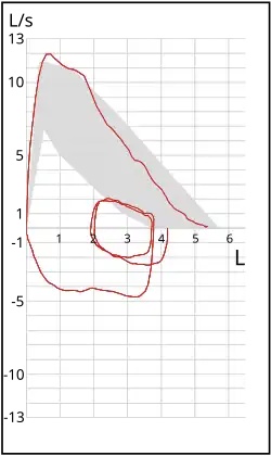 - une boucle débit-volume, ce qui représente graphiquement le débit d'air sur l'axe Y et le volume total inspiré ou expiré sur l'axe X.