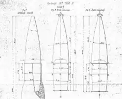 Une nouvelle balle aérodynamique Spitzgeschoß, attribuée au balisticien indépendant Arthur Gleinich, a été testée en 1902 et officiellement adoptée le 3 avril 1903. Après plusieurs révisions de forme, il est entré en production de masse en 1904. Le nez du Spitzgeschoß était pointu à l'extérieur comme le design français et sa forme était brevetée, mais la veste entièrement métallique du Spitzgeschoß différait en interne[6],[7],[8]. Le programme Gewehr-Prüfungskommission a abouti à la cartouche S Patrone ou 7,92 × 57 mm Mauser, qui était d'un poids de 9,9g et avec la balle spitzer d'un diamètre légèrement augmenté de 8,2 mm (0,32283464534 po) qui avait un coefficient balistique (G1 BC) d'environ 0,321 à 0,337 (les coefficients balistiques sont quelque peu discutables), ainsi qu'un chambrage et un alésage dimensionnellement repensés (désignés comme "alésage S") et une nouvelle poudre sans fumée (à base de nitrocellulose et nitroglycérine ), qui a permis d'améliorer considérablement la vitesse initiale de 878m/s à partir d'un canon de 740mm. Le S Patrone a été adopté par l'armée et la marine allemandes en 1903 et avait une portée terminale maximale d'environ 3 700 m (4 050 yd)[9]. La combinaison d'une vitesse initiale accrue et d'une aérodynamique améliorée des balles a fourni une trajectoire de balle beaucoup plus plate, ce qui a augmenté la probabilité de toucher une cible individuelle à la plupart des distances de combat typiques.