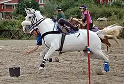 • Polo : sport équestre collectif le plus ancien dans lequel deux équipes de quatre cavaliers s'affrontent en envoyant une balle dans les buts adverses grâce à un long maillet ;