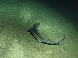 Les nageoires pectorales sont courtes, alors que les nageoires pelviennes sont longues et relativement grandes. Les nageoires dorsales sont petites, et la première d'entre elles apparaît derrière le point de naissance des nageoires pelviennes. Il n'y a pas de nageoire anale. Le pédoncule caudal, robuste, ne présente pas d'échancrure à la base de la nageoire caudale. La nageoire caudale hétérocerque possède un lobe inférieur indistinct et un lobe supérieur qui ne présente pas d'encoche sur le bord arrière[8].
