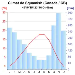 Squamish est un des endroits les plus pluvieux de tout le Canada, les précipitations peuvent y atteindre 2400 mm par an. Les pluies tombent souvent de manière continue sur de longues périodes, notamment en hiver. En comparaison d'autres régions du Canada, la neige n'est pas spécialement fréquente en hiver ; cependant des chutes de 50 cm peuvent survenir, mais généralement la neige tombée fond assez rapidement.