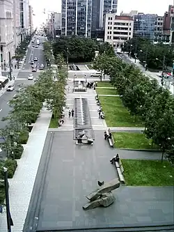 Des terrasses ornées de sculptures modernes, de jets d'eau enlignés et de bancs, réservent de la place à des arbres individuels, au nord, ou groupés en un boisé, au sud.