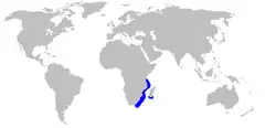 Cette espèce se rencontre dans l'ouest de l'océan Indien, dans les eaux chaudes et tropicales de la Tanzanie jusqu'aux côtes du Cap en Afrique du Sud. Elle est présente jusqu'à une profondeur maximale de 494 m mais habituellement entre 60 et 300 m de profondeur.