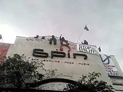 Gremlins manifestant sur le toit du bâtiment squatté du Spin Bowling à Cardiff, en 2012