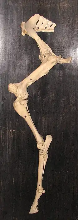 - Fémur : le plus gros os long chez un cheval. Proximalement, il forme une articulation à rotule avec le bassin pour former l'articulation de la hanche, et distalement il rencontre le tibia et la rotule au niveau de l'articulation du grasset. Il sert de point d'attache pour les muscles fessiers profonds et moyens, ainsi que pour les ligaments accessoires et ronds.