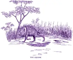 Le squonk est une créature très laide, et consciente de cela. À cause de sa peau plissée, recouverte de verrues et autres marques peu ragoûtantes, il se cache afin de ne pas être aperçu, et passe son temps à pleurer douloureusement sur sa propre laideur. Les chasseurs ayant essayé d’attraper des squonks se sont bien vite aperçus que cette créature était capable de s’échapper par une dissolution complète impliquant une transformation en une mare de larmes et de bulles quand il devenait captif. On raconte qu’un certain J.P Wentling aurait réussi à en amadouer un et à le mettre dans un sac, qu’il ramena chez lui, ce dernier étrangement léger. En l’inspectant, il vit que le sac n’était plus rempli que d’un liquide, seul vestige de la mélancolique créature.